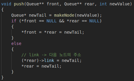 주의: Stack에서 link는 이전 노드였다면, Queue에서는 다음 노드를 가리킨다!