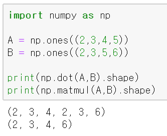 A, B 마지막 두 배열 값으로 내적(나머지 앞의 값들은 같아야 함)
