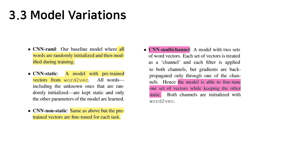 non-static layer: weight 업데이트 하면서 word vector도 업데이트