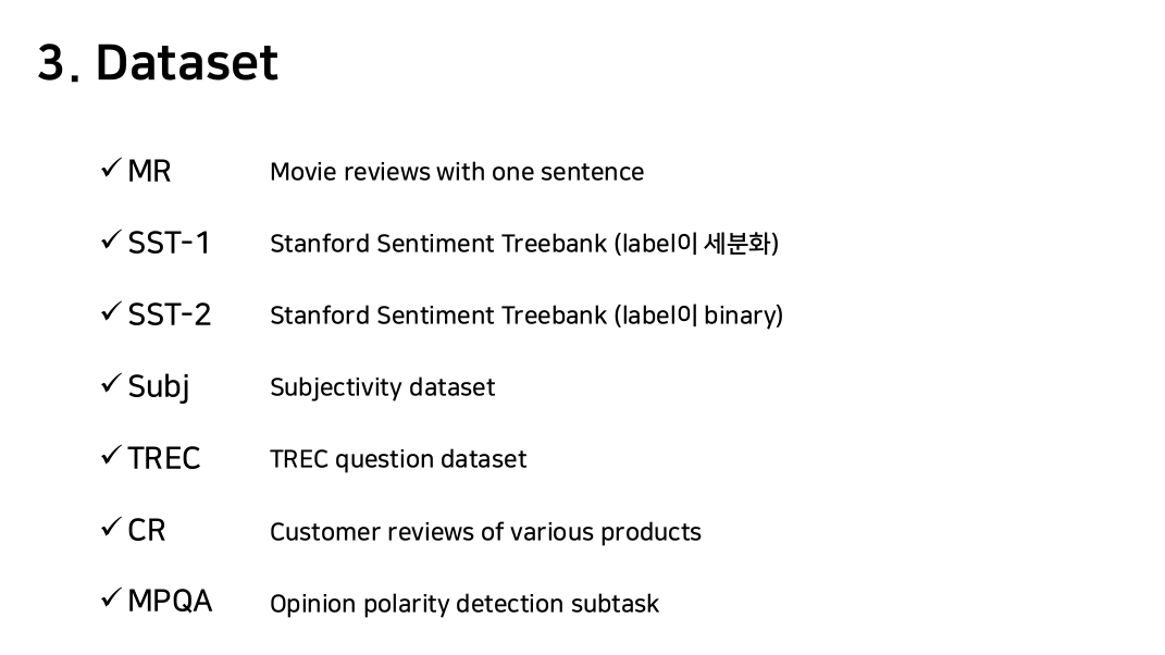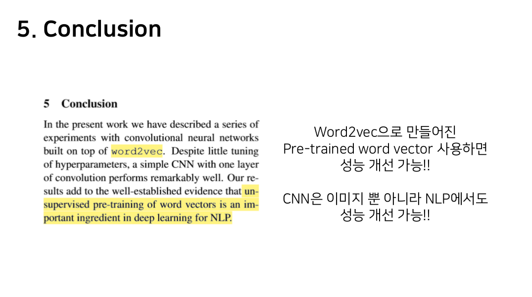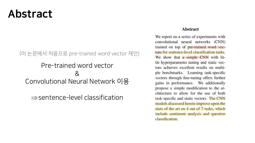 이 논문은 pre-trained word vector과 CNN을 사용하여 sentence classification을 진행했다.