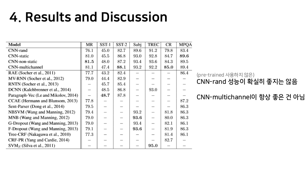 pre-trained word vector 사용 없이 randomly initialization한 CNN-rand 성능은 좋지 않은 결과를 냄