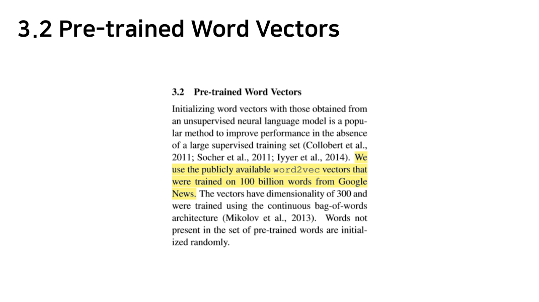 Google News에서 제공하는 word 1000억개로 학습시킨 word2vec 벡터를 Pre-trained word vector로 사용