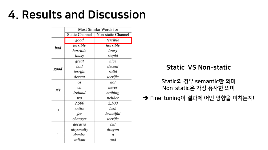하지만, CNN-static과 CNN-non-static 모델을 둘 다 사용한다고 해서 항상 좋은 성능을 내는 것도 아니다.